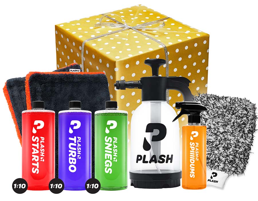 Lielais dāvanu komplekts ietver visu nepieciešamo, lai mājās pilnībā nomazgātu automašīnu un piešķirtu tai aizsardzību. Plash STARTS priekšmazgātājs iesūcas netīrumos un palīdz tos atraut no virsmas, sagatavojot auto mazgāšanai. Plash SNIEGS ļauj uzklāt vienmērīgu putu kārtu ar putu smidzinātāju vai izmantot to kā šampūnu spainī kontaktmazgāšanai. Abi līdzekļi ir pH balansēti, tāpēc droši izmantojami arī uz auto ar keramiku vai aizsargplēvi. Plash mikrošķiedru cimds nodrošina saudzīgu mazgāšanu bez skrāpējumiem, bet žāvēšanas dvielis ar lielu uzsūktspēju novērš ūdens traipu veidošanos. Plash putu smidzinātājs palīdz vienmērīgi uzklāt līdzekļus un padara procesu ērtāku.